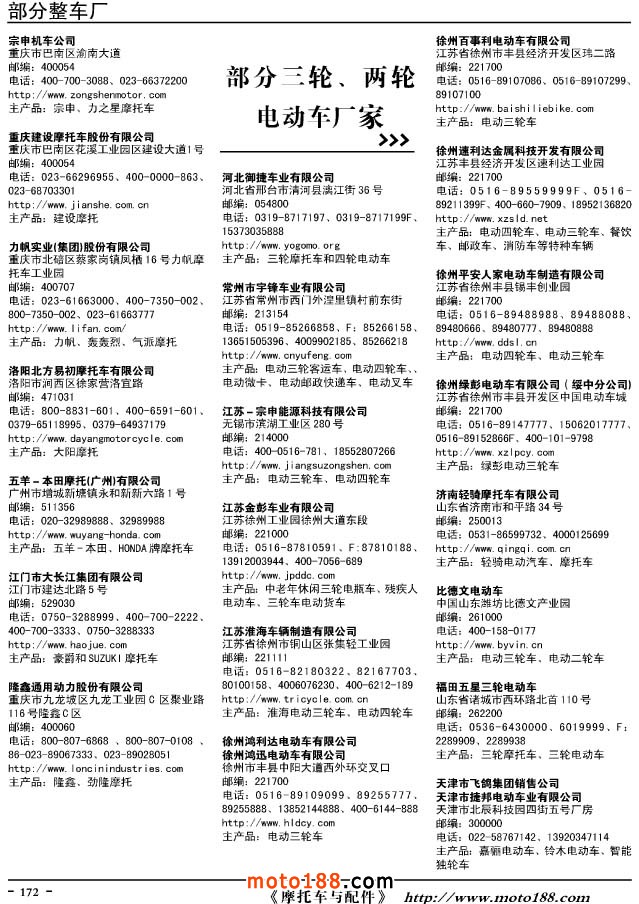 這兩年行業(yè)調(diào)整力度非常大,為了確保我們提供的信息準(zhǔn)確性,我們本著寧缺毋濫的原則,不去圖虛的數(shù)量。目前摩托車與配件行業(yè)的不少經(jīng)銷商是跨行業(yè)經(jīng)營(yíng)的,所以我們?cè)诒緯?shū)中增加了部分摩托車整車廠、電動(dòng)車生產(chǎn)廠、機(jī)動(dòng)三輪車制造廠。所選的這些企業(yè)都是這個(gè)行業(yè)具有影響力的品牌企業(yè),是為了大家在使用這本書(shū)時(shí),獲取相關(guān)的延伸產(chǎn)業(yè)更多的實(shí)用信息。