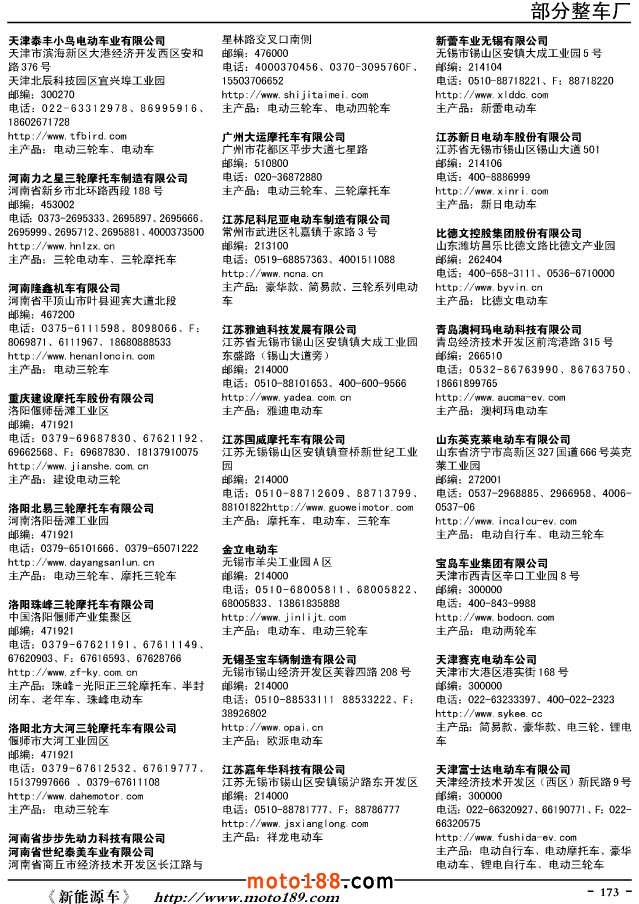 這兩年行業(yè)調整力度非常大,為了確保我們提供的信息準確性,我們本著寧缺毋濫的原則,不去圖虛的數(shù)量。目前摩托車與配件行業(yè)的不少經(jīng)銷商是跨行業(yè)經(jīng)營的,所以我們在本書中增加了部分摩托車整車廠、電動車生產廠、機動三輪車制造廠。所選的這些企業(yè)都是這個行業(yè)具有影響力的品牌企業(yè),是為了大家在使用這本書時,獲取相關的延伸產業(yè)更多的實用信息。