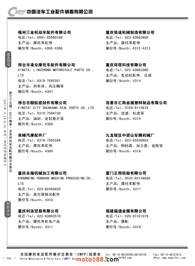 ”全國摩托車及配件展示會“(CMPF)是中國摩托車行業的傳統盛會,自1981年至今已成功舉辦了67季次(每年春、秋季各舉辦一次),現已發展成為行業內規模最大、專業觀眾最多、影響最廣泛、參展商最有收獲的全國性品牌展會。CMPF展會聚集了全國大部分摩托車配件生產企業與流通企業,是產需雙方進行貿易洽談、新產品技術推廣與交流的理想服務平臺。
