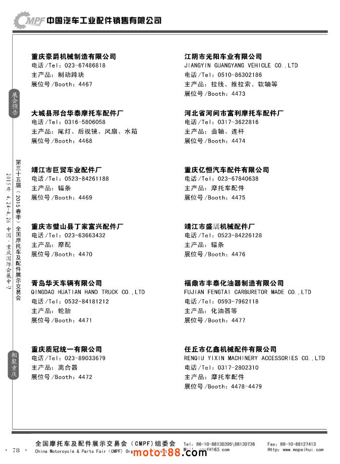 ”全國摩托車及配件展示會“(CMPF)是中國摩托車行業的傳統盛會,自1981年至今已成功舉辦了67季次(每年春、秋季各舉辦一次),現已發展成為行業內規模最大、專業觀眾最多、影響最廣泛、參展商最有收獲的全國性品牌展會。CMPF展會聚集了全國大部分摩托車配件生產企業與流通企業,是產需雙方進行貿易洽談、新產品技術推廣與交流的理想服務平臺。