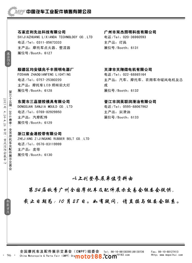 ”全國摩托車及配件展示會“(CMPF)是中國摩托車行業的傳統盛會,自1981年至今已成功舉辦了67季次(每年春、秋季各舉辦一次),現已發展成為行業內規模最大、專業觀眾最多、影響最廣泛、參展商最有收獲的全國性品牌展會。CMPF展會聚集了全國大部分摩托車配件生產企業與流通企業,是產需雙方進行貿易洽談、新產品技術推廣與交流的理想服務平臺。