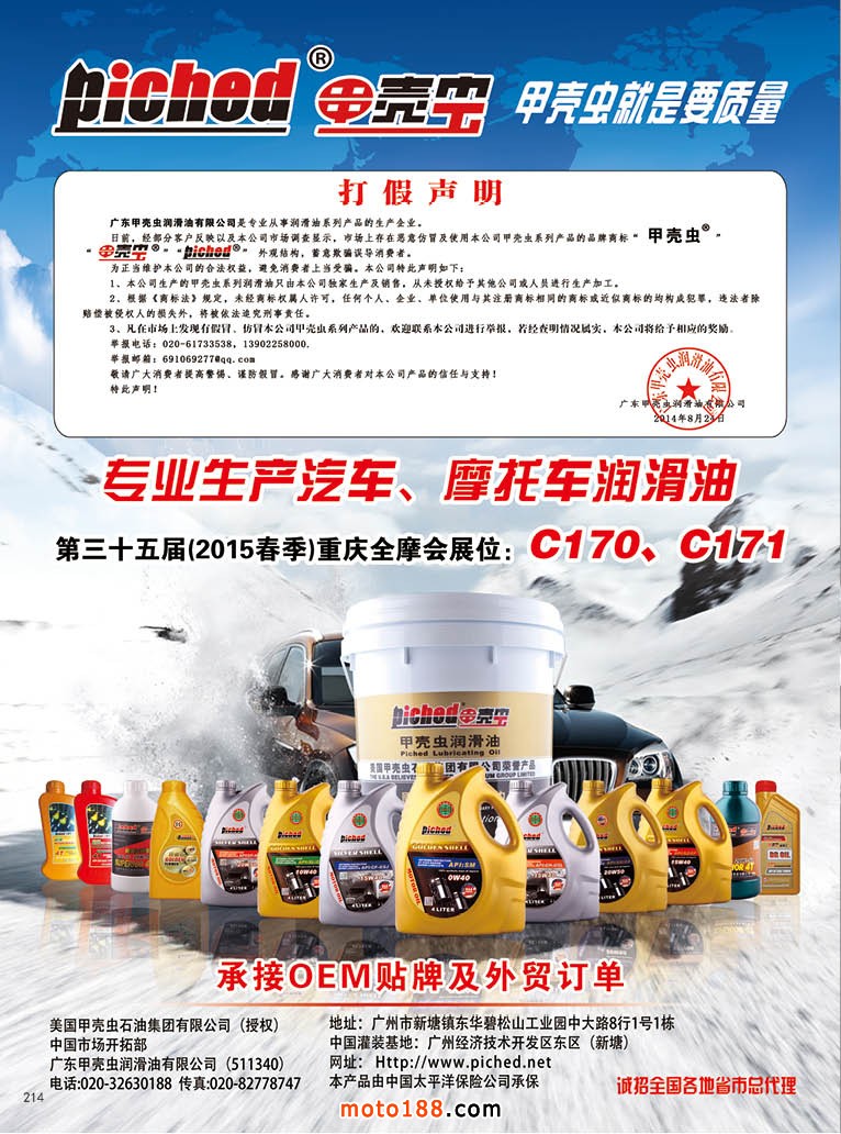 2015年的春天姍姍來遲,行業的盛會卻已盛裝已待。今春我們聚集在中國也是世界最大的摩托車配件生產基地重慶。目前行業形勢一如國家的經濟形勢依然嚴峻,但是我們摩配行業的從業人員,頂住困難以堅韌不拔的毅力,不離不棄奮斗在這個行業,通過重慶這樣一個大的展示平臺展示我們行業的精氣神。我們也帶來了這半年的勞動成果,和大家分享。