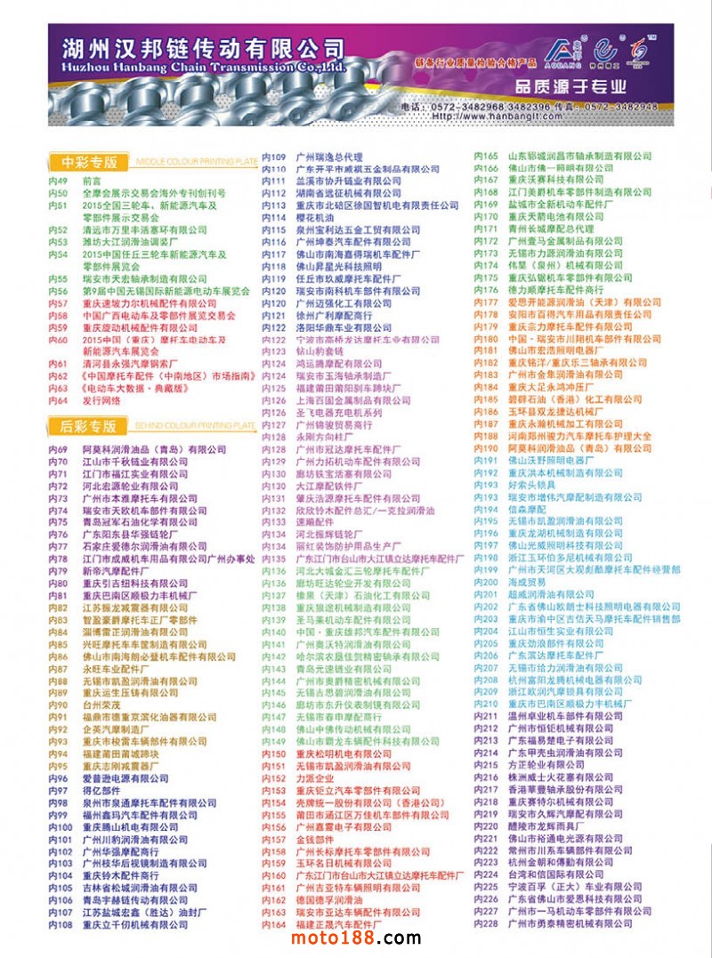 今年第四期雜志雖然在全國市場都有發(fā)行,一些不在市場的地區(qū)商戶除了通過www.moto188.com網(wǎng)站閱讀,也可到我們展位直接領取。由于本期雜志需要宣傳的企業(yè)較多,原來的摩托車及電動車行業(yè)的資訊的內(nèi)容,順延到下一期發(fā)布。
