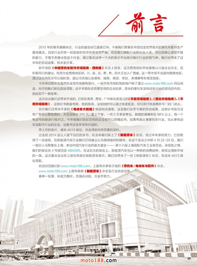 今年第四期雜志雖然在全國市場都有發行,一些不在市場的地區商戶除了通過www.moto188.com網站閱讀,也可到我們展位直接領取。由于本期雜志需要宣傳的企業較多,原來的摩托車及電動車行業的資訊的內容,順延到下一期發布。