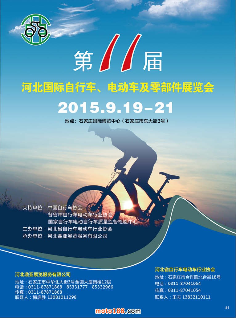2015.7雜志(曲軸)日期:2015-06-29 點(diǎn)擊:2359 查看原圖 全部展開![]() ![]() ![]() 內(nèi)41 第11屆河北國(guó)際自行車、電動(dòng)車及零部件展覽會(huì)
