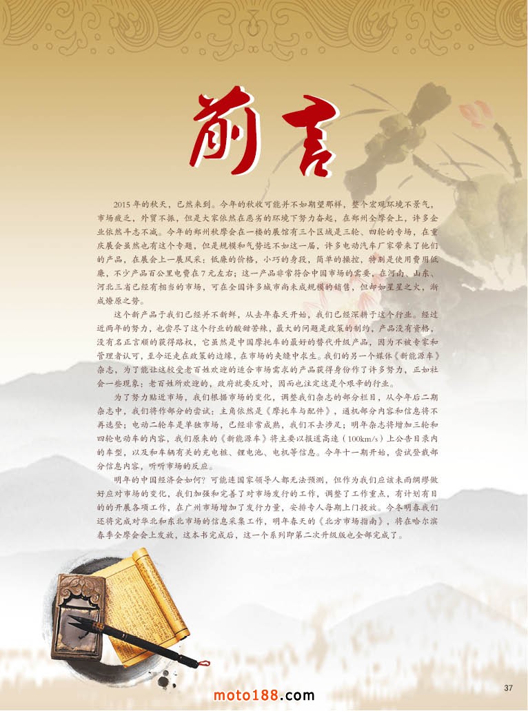 為了努力貼近市場,我們根據市場的變化,調整我們雜志的部分欄目,從今年后二期雜志中,我們將作部分的嘗試:主角依然是《摩托車與配件》,通機部分內容和信息將不再選登;電動二輪車是單獨市場,已經非常成熟,我們不去涉足;明年雜志將增加三輪和四輪電動車的內容,我們原來的《新能源車》將主要以報道高速(100km/s)上公告目錄內的車型,以及和車輛有關的充電樁、鋰電池、電機等信息。今年十一期開始,嘗試登載部分信息內容,聽聽市場的反應。