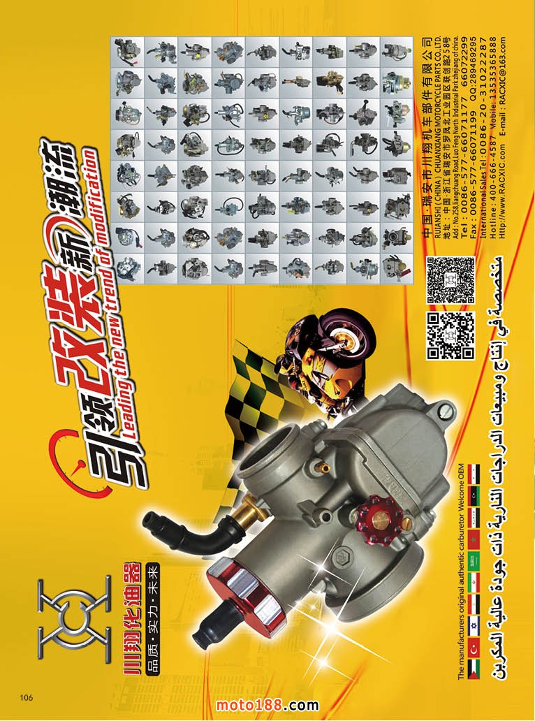 直是銷售疲軟。許多廠家也不再以單一產(chǎn)品為主;配套結(jié)算難,部分廠家的突然倒閉,更加大經(jīng)營風險;中國摩托車配件在外銷出口上,還能保持相當?shù)某隹诹浚覀冊趶V州看到這一市場,不少企業(yè)做得風生水起。中國摩托車配件雖然技術(shù)含量一般,但較高的性價比還是贏得了第三世界國家的消費者的青睞,勤勞的摩配商家紛紛走出去、請進來,將中國制造觸角伸向世界各地。
