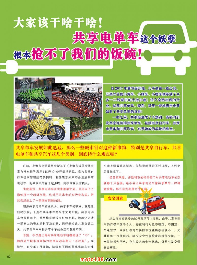 2017.7月《摩托車/電動車與配件》雜志,歡迎大家閱讀日期:2017-06-29 點擊:1162 查看原圖 全部展開![]() ![]() ![]() 內52 大家該干啥干啥!共享電單車這個妖孽,搶不了我們的飯碗!