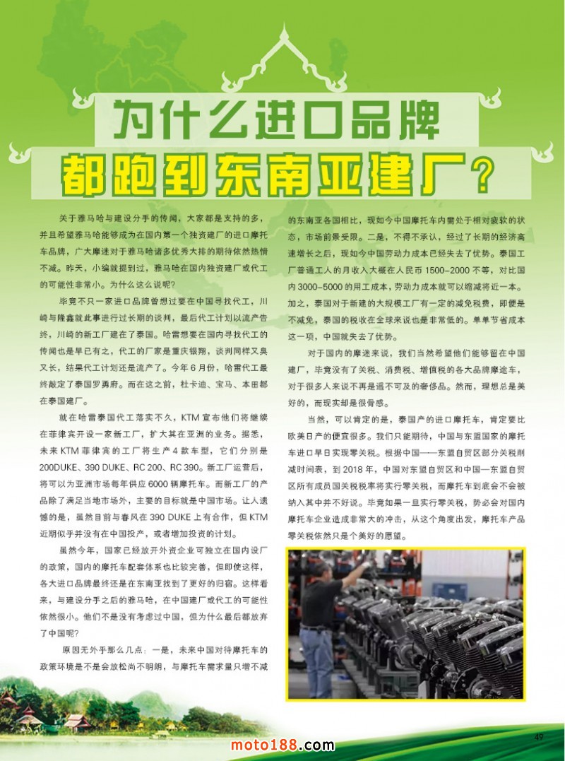 本期雜志出刊后,行業銷售季節也就開始,在今年不溫不火的摩配不景氣的狀況下,國內摩配市場輝煌已離我們而去,面對內銷雞肋般的市場,摩配的外貿出口也逐漸的失去國際市場的競爭力,取代而之的是印度摩托車,中國摩托車發展到今天有多種原因造成,不便一一而述。