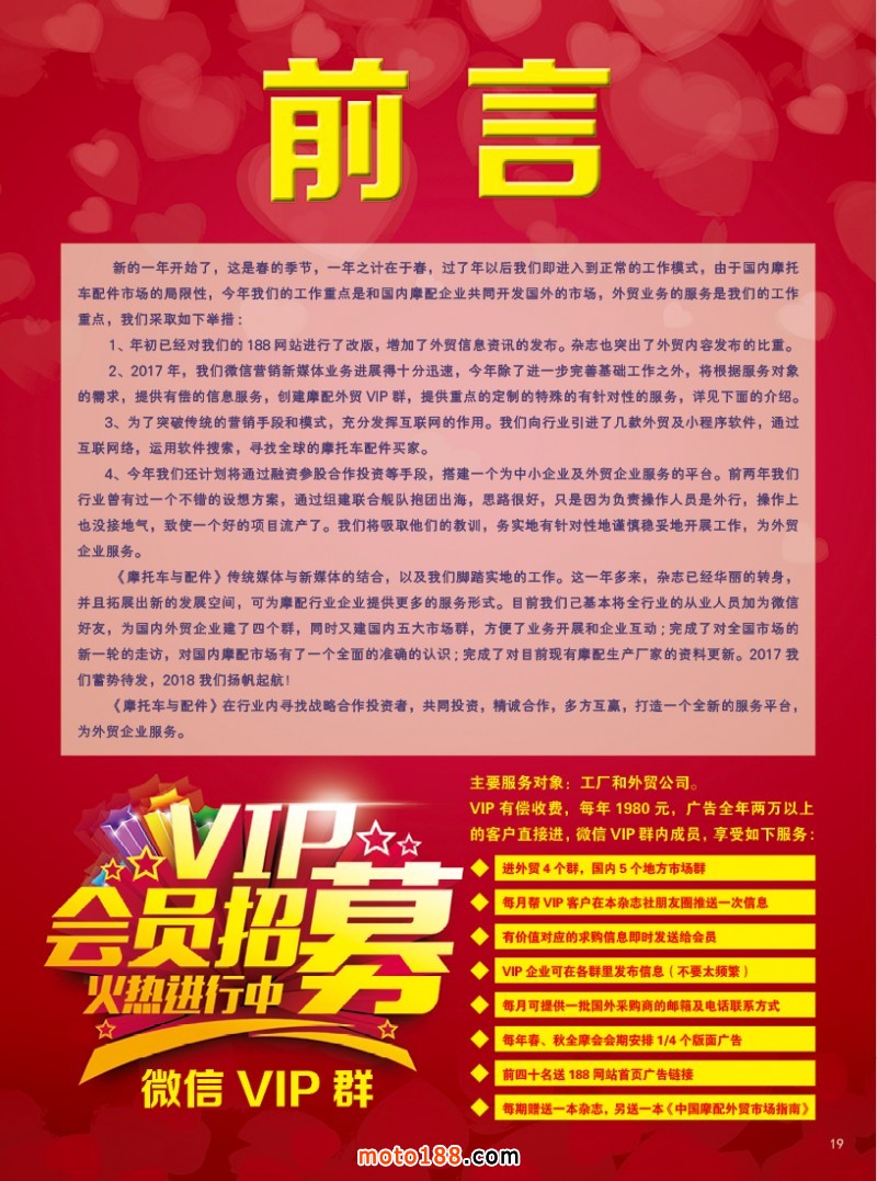 《摩托車與配件》傳統(tǒng)媒體與新媒體的結(jié)合,以及我們腳踏實(shí)地的工作。這一年多來,雜志已經(jīng)華麗的轉(zhuǎn)身,并且拓展出新的發(fā)展空間,可為摩配行業(yè)企業(yè)提供更多的服務(wù)形式。目前我們己基本將全行業(yè)的從業(yè)人員加為微信好友,為國(guó)內(nèi)外貿(mào)企業(yè)建了四個(gè)群,同時(shí)又建國(guó)內(nèi)五大市場(chǎng)群,方便了業(yè)務(wù)開展和企業(yè)互動(dòng);完成了對(duì)全國(guó)市場(chǎng)的新一輪的走訪,對(duì)國(guó)內(nèi)摩配市場(chǎng)有了一個(gè)全面的準(zhǔn)確的認(rèn)識(shí);完成了對(duì)目前現(xiàn)有摩配生產(chǎn)廠家的資料更新。2017我們蓄勢(shì)待發(fā),2018我們揚(yáng)帆起航!