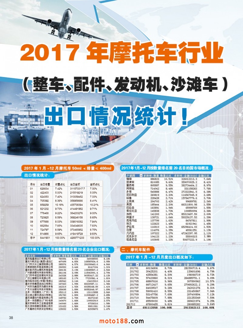 2018.3月《摩托車/電動車與配件》雜志,歡迎大家閱讀日期:2018-03-06 點擊:1293 查看原圖 全部展開![]() ![]() ![]() 內(nèi)38 2017年摩托車行業(yè)出口情況統(tǒng)計!