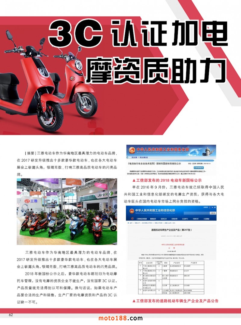 2018.3月《摩托車(chē)/電動(dòng)車(chē)與配件》雜志,歡迎大家閱讀日期:2018-03-06 點(diǎn)擊:1293 查看原圖 全部展開(kāi)![]() ![]() ![]() 內(nèi)62 3C認(rèn)證加電摩資質(zhì)助力三雅品質(zhì)