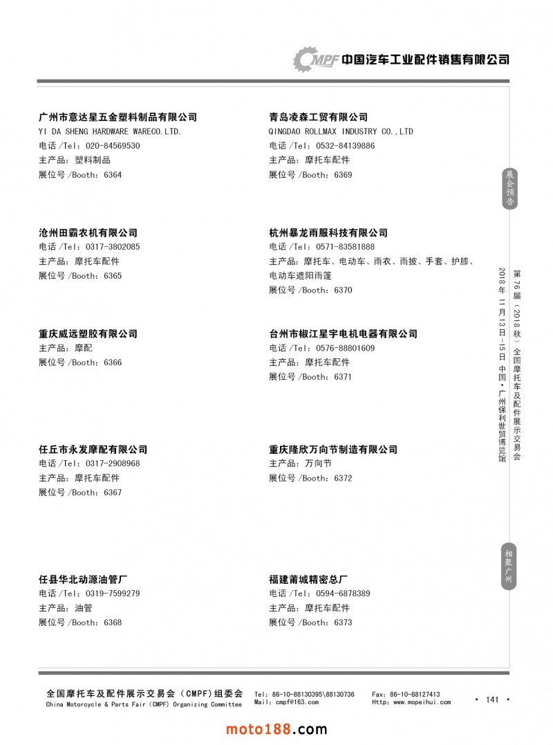 內141 第75屆(2018春)全國摩托車及配件展示交易會-重慶站參展企業信息
