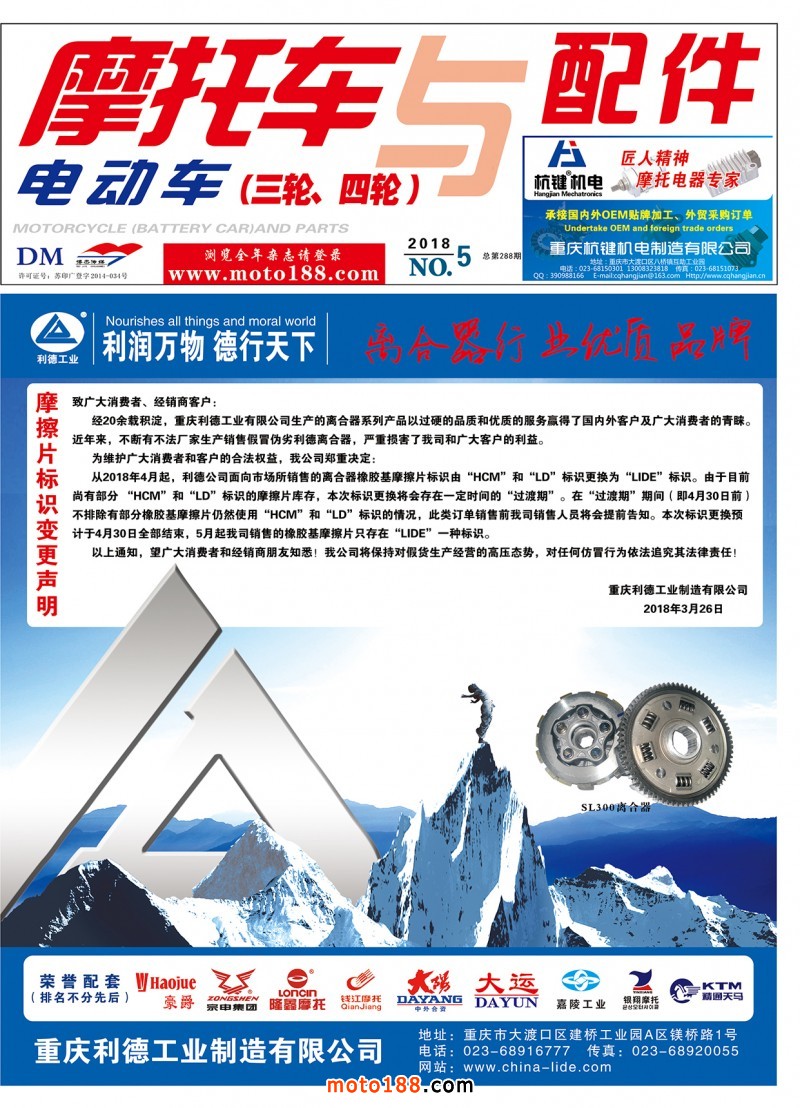 2018.5月《摩托車/電動車與配件》雜志,歡迎大家閱讀日期:2018-04-25 點擊:1893 查看原圖 全部展開![]() ![]() ![]() 封面 重慶利德工業(yè)制造有限公司
