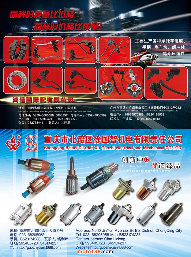 從今年的6月到10月上旬,我們還將對16年編撰的《摩配華南市場指南》進行升級,中英文雙語出版,新版本將在下半年第76屆廣州全國摩托車及配件展示交易會首發;并在廣州重慶摩配市場全面派送;在廣州福星、松南市場門口、及白云210/002/607三個檔口常年設立發行窗口;發行至廣州、重慶、江浙的主要廠家,目前收集整理、核對校正信息,編排翻譯的工作正在進行之中,需要在最新《華南市場指南》升級版做宣傳的企業,請和我們以及各地的工作站人員聯絡。