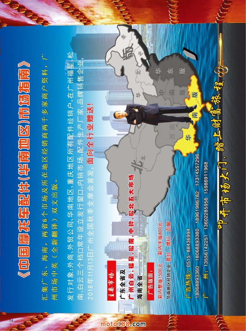 從現在到10月上旬,我們還將對16年編撰的《摩配華南市場指南》進行升級,中英文雙語出版,新版本將在下半年第76屆廣州全國摩托車及配件展示交易會首發;并在廣州重慶摩配市場全面派送;在廣州福星、松南市場門口、及白云210/002/607三個檔口常年設立發行窗口;發行至廣州、重慶、江浙的主要廠家,目前收集整理、核對校正信息,編排翻譯的工作正在進行之中,需要在最新《華南市場指南》升級版做宣傳的企業,請和我們以及各地的工作站人員聯絡。