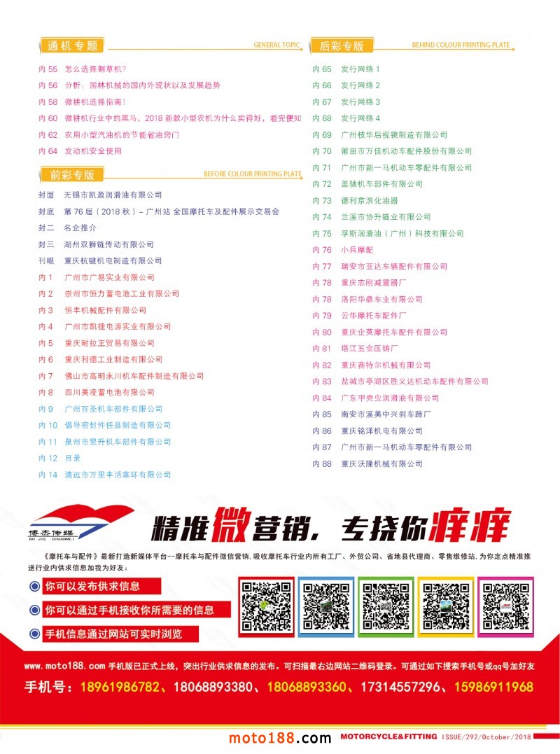 秋季廣州全摩會召開在即,《摩配華南市場指南》升級版,將在下半年第76屆廣州全國摩托車及配件展示交易會首發(fā),歡迎參展企業(yè)和參展觀眾到3109展位領取;隨后在廣州、重慶摩配市場全面派送,在廣州福星、松南市場門口、及白云210/002/607三個檔口常年設立發(fā)行窗口;發(fā)行至廣州、重慶、江浙的幾大板塊主要廠家,需要在最新《華南市場指南》升級版做宣傳的企業(yè),請盡快和我們以及各地的工作站人員聯(lián)絡,截稿在即,時不我待。