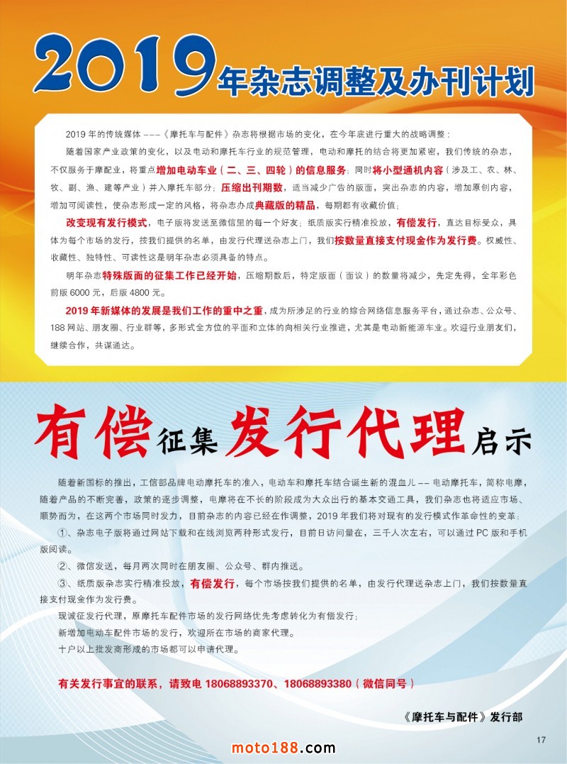 綜上所述,2019年我們將進行兩項重大變革:以定位摩托車配件內容為主體的《摩托車與配件》,將變更成電動摩托與配件為主體《電摩與配件》;傳統紙媒為主的雜志,將變更為以互聯網+紙媒雜志,并以互聯網+新媒體為主。具體的舉措為: