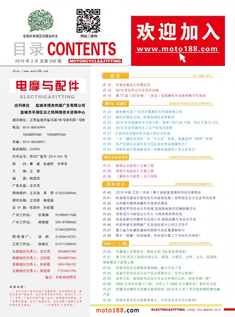 在這個春天里我們感受到和風(fēng)拂面,我們更堅定了信心,我們傳統(tǒng)媒體務(wù)實(shí)的發(fā)展和經(jīng)營,基礎(chǔ)工作在不斷的加厚夯實(shí),今年我們雜志進(jìn)行了大調(diào)整,一年只在銷售季里出刊,全年出刊四期精品,本期雜志就有許多重要信息發(fā)布:政策面上的行業(yè)和地方上的重要政策(如前所述),18年的市場數(shù)據(jù)匯總分析,通機(jī)產(chǎn)品技術(shù)介紹 ,行業(yè)有關(guān)的重要國際資訊,國際巨頭研發(fā)生產(chǎn)的情況動態(tài),電摩行業(yè)電動三四輪及動力電池最新的國家和地方政策,從海量的信息里精挑細(xì)選,每一遍文章都能讓讀者開卷有限,同時還值得收藏。