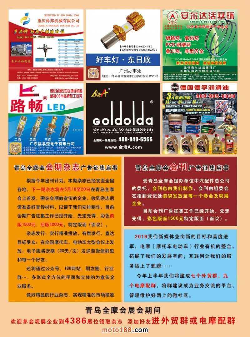 下一期雜志將在5月18日-20日在青島全摩會上首發,會期的效果更優于平常,需在會期做宣傳的企業,收到雜志后你就可以準備材料了。受會議組辦單位中汽配件總公司的委托,會刊也由我們制作,我們的展位號4386,歡迎來我們展位領取雜志,會刊由組委會在報到登記處發放。