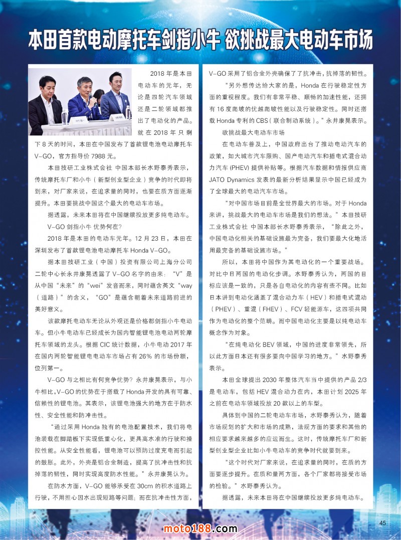 在這個春天里我們感受到和風拂面,我們更堅定了信心,我們傳統媒體務實的發展和經營,基礎工作在不斷的加厚夯實,今年我們雜志進行了大調整,一年只在銷售季里出刊,全年出刊四期精品,本期雜志就有許多重要信息發布:政策面上的行業和地方上的重要政策(如前所述),18年的市場數據匯總分析,通機產品技術介紹 ,行業有關的重要國際資訊,國際巨頭研發生產的情況動態,電摩行業電動三四輪及動力電池最新的國家和地方政策,從海量的信息里精挑細選,每一遍文章都能讓讀者開卷有限,同時還值得收藏。