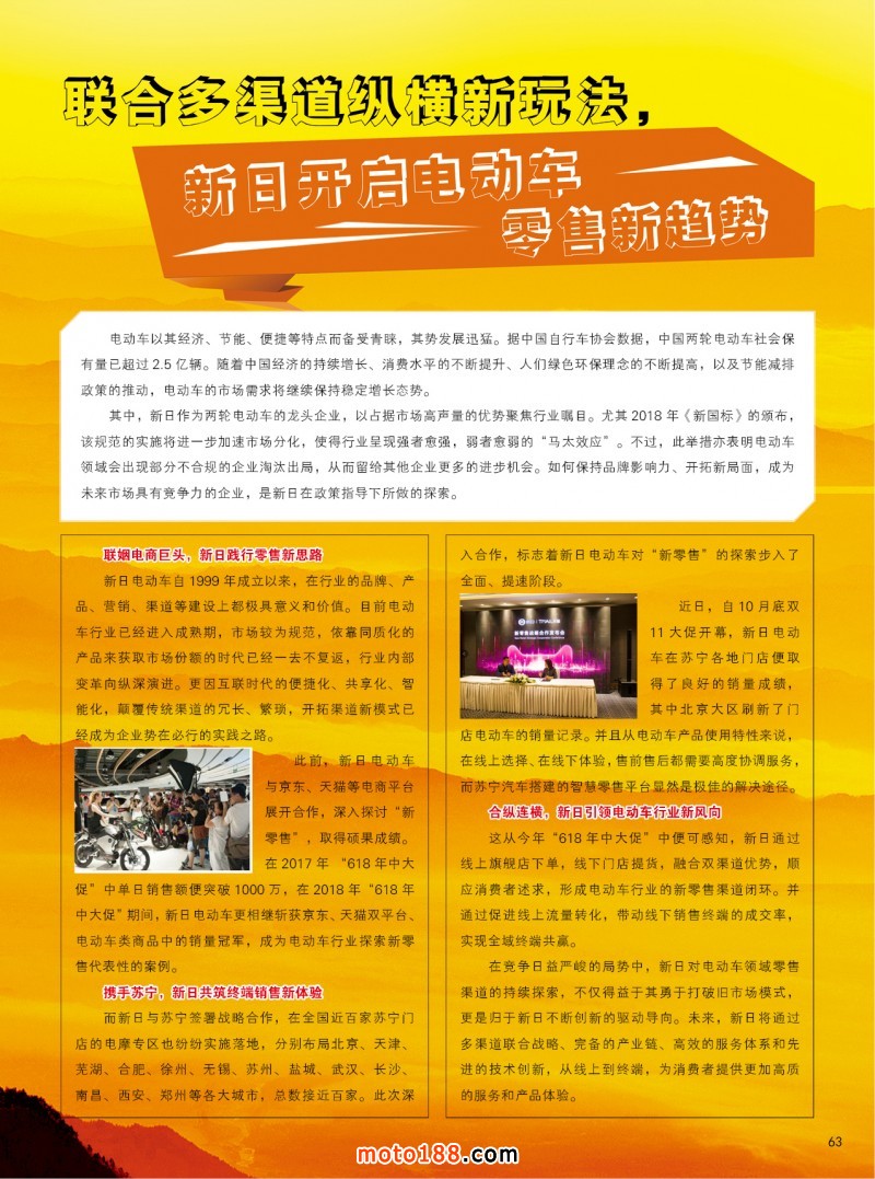 在這個春天里我們感受到和風拂面,我們更堅定了信心,我們傳統媒體務實的發展和經營,基礎工作在不斷的加厚夯實,今年我們雜志進行了大調整,一年只在銷售季里出刊,全年出刊四期精品,本期雜志就有許多重要信息發布:政策面上的行業和地方上的重要政策(如前所述),18年的市場數據匯總分析,通機產品技術介紹 ,行業有關的重要國際資訊,國際巨頭研發生產的情況動態,電摩行業電動三四輪及動力電池最新的國家和地方政策,從海量的信息里精挑細選,每一遍文章都能讓讀者開卷有限,同時還值得收藏。