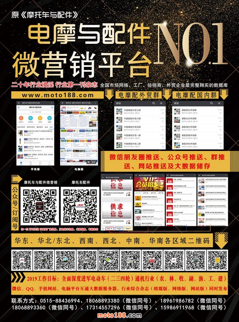 在這個春天里我們感受到和風拂面,我們更堅定了信心,我們傳統媒體務實的發展和經營,基礎工作在不斷的加厚夯實,今年我們雜志進行了大調整,一年只在銷售季里出刊,全年出刊四期精品,本期雜志就有許多重要信息發布:政策面上的行業和地方上的重要政策(如前所述),18年的市場數據匯總分析,通機產品技術介紹 ,行業有關的重要國際資訊,國際巨頭研發生產的情況動態,電摩行業電動三四輪及動力電池最新的國家和地方政策,從海量的信息里精挑細選,每一遍文章都能讓讀者開卷有限,同時還值得收藏。