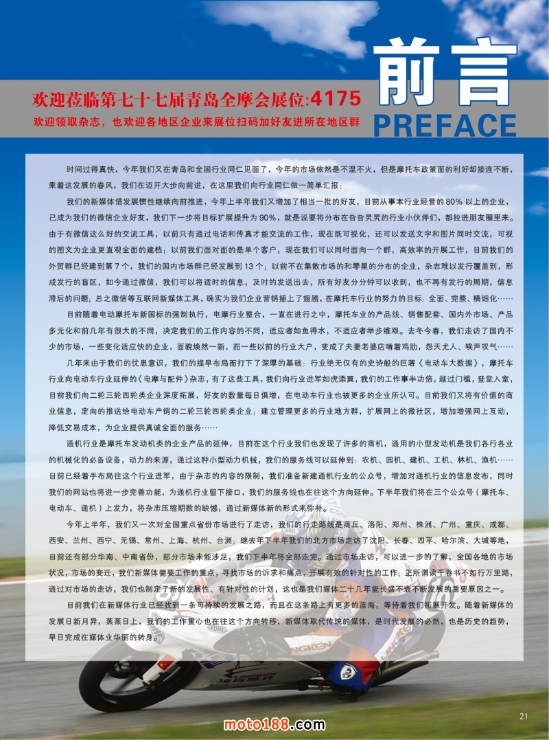 時間過得真快,今年我們又在青島和全國行業同仁見面了,今年的市場依然是不溫不火,但是摩托車政策面的利好卻接連不斷,乘著這發展的春風,我們在邁開大步向前進,在這里我們向行業同仁做一簡單匯報: