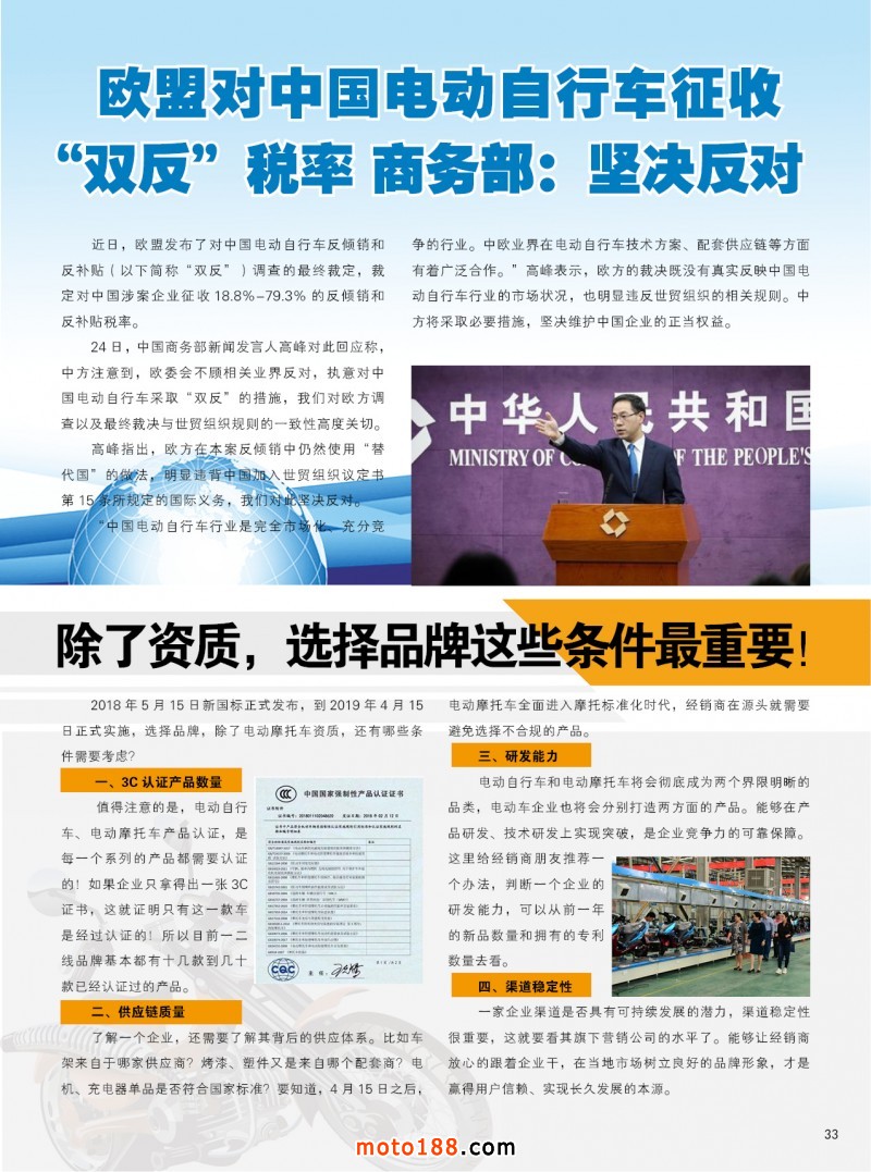 2019.5月《摩托車/電動車與配件》雜志,歡迎大家閱讀日期:2019-05-08 點擊:1861 查看原圖 全部展開![]() ![]() ![]() 內33 歐盟對中國電動自行車征收“雙反”稅率 商務部:堅決反對