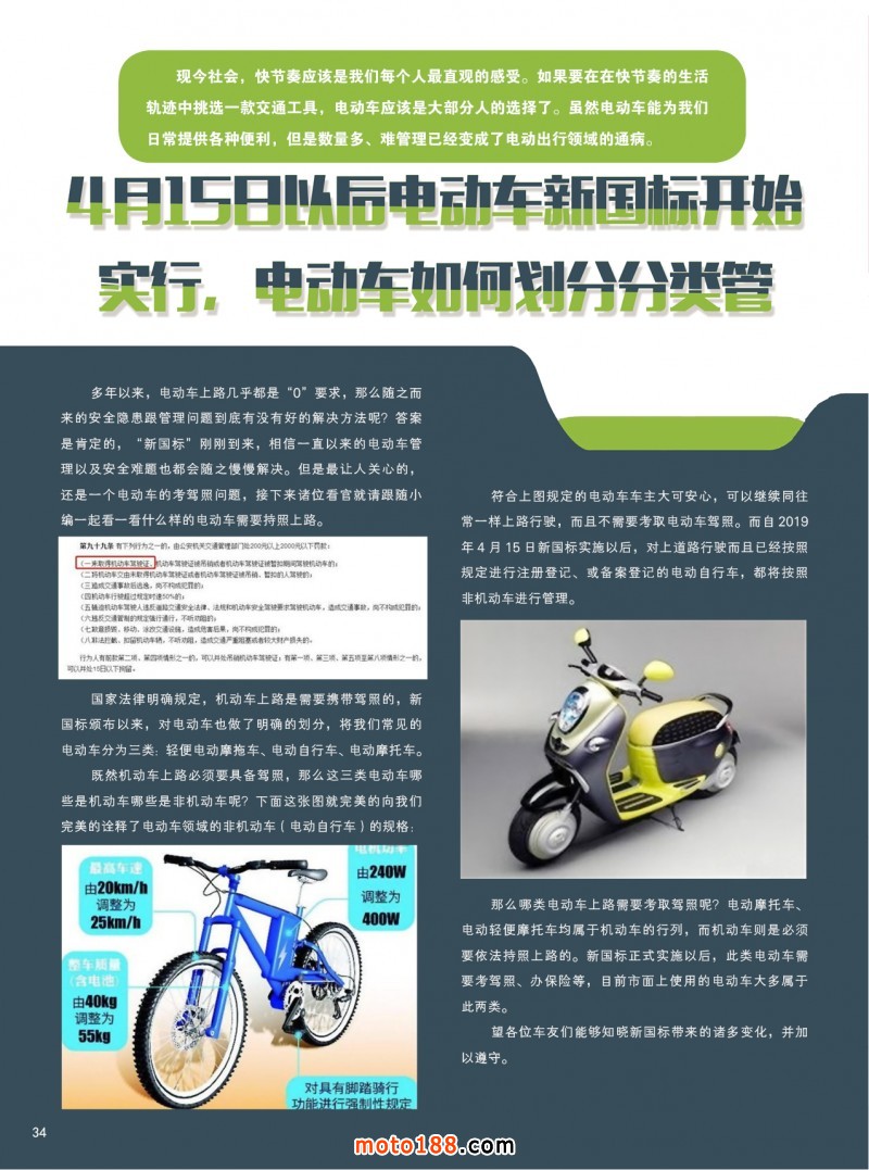 2019.5月《摩托車/電動(dòng)車與配件》雜志,歡迎大家閱讀日期:2019-05-08 點(diǎn)擊:1861 查看原圖 全部展開![]() ![]() ![]() 內(nèi)34 4月15日以后電動(dòng)車新國標(biāo)開始實(shí)行,電動(dòng)車如何劃分分類管