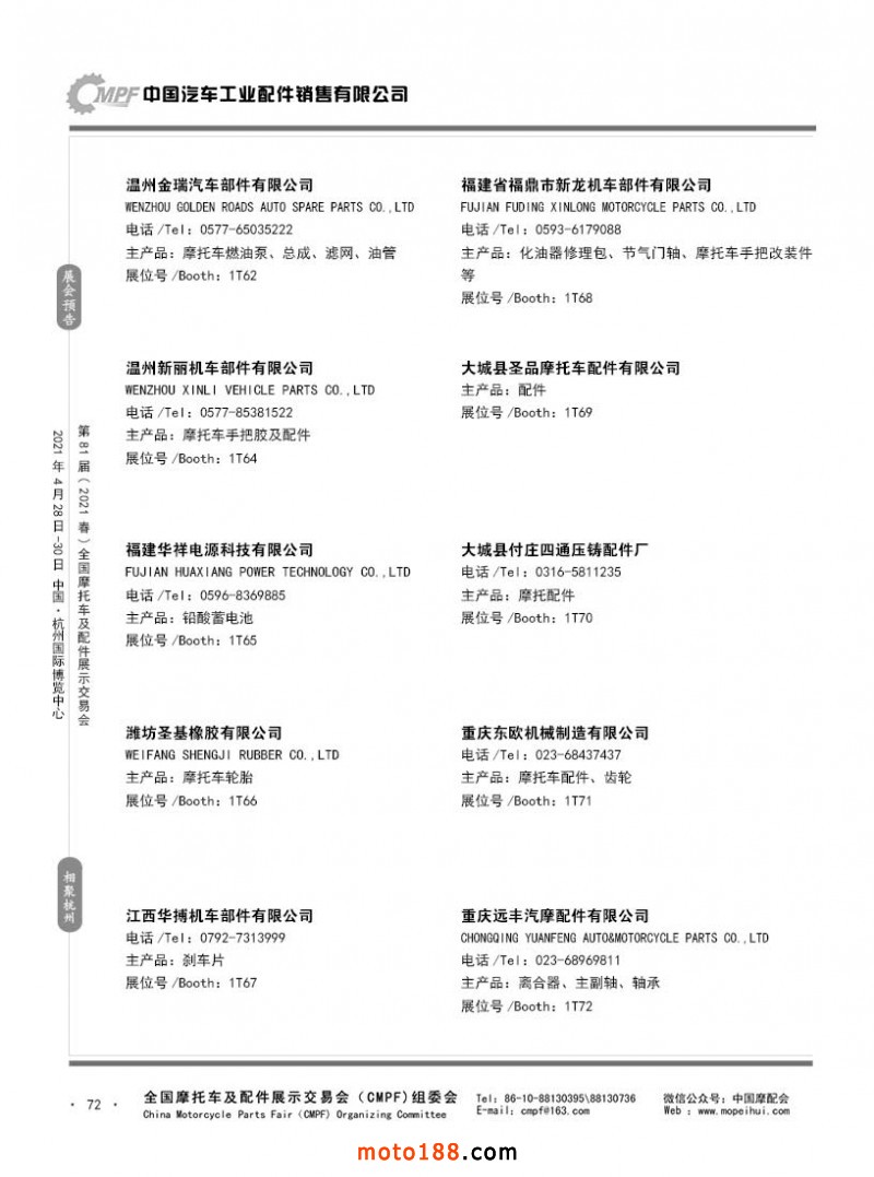 內(nèi)72 第80屆(2020秋)全國摩托車及配件展示交易會-廣州站參展企業(yè)信息