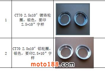 求購CT70越野摩托車輪圈,型號:1、CT70 2.5*10“ 鍍鉻輪圈,銀色,要印 2.5*10“ 字樣。2、CT70 2.5*10“ 鋁輪圈,銀色,要印 2.5*10“ 字樣。數量:各100個,聯系電話:13822360055,聯系人:catherine