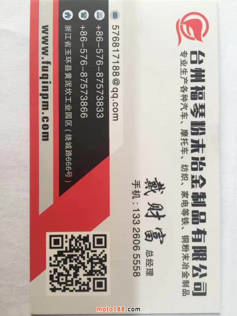 臺州福琴粉末冶金制品有限公司,本公司專業生產粉末冶金鐵、銅基制造汽車、摩托車、電動工具等配件,熱烈歡迎各界朋友前來參觀、考察、洽談業務。聯系電話:13326065558,聯系人:戴先生