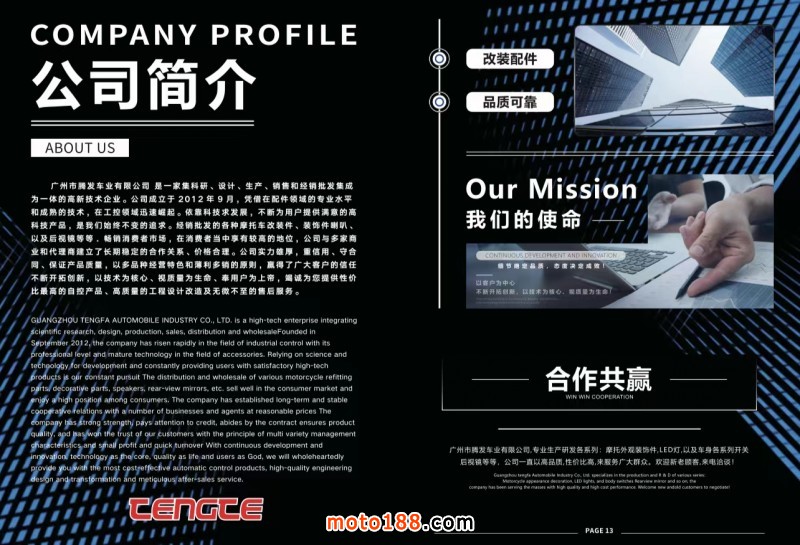 廣州市騰發車業有限公司,專業生產研發各系列:摩托外觀裝飾件,LED燈,以及車身各系列開關,后視鏡等等,公司一直以高品質,性價比高,來服務廣大群眾。歡迎新老顧客,來電洽談!