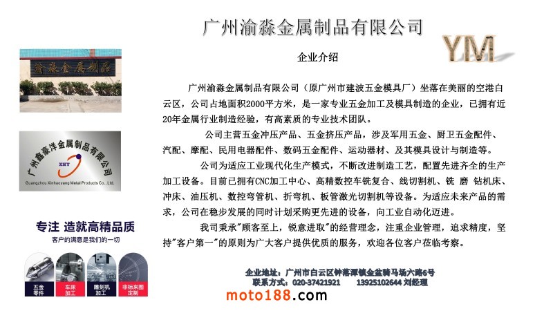 廣州渝淼金屬制品有限公司主營五金沖壓產品、五金擠壓產品,涉及軍用五金、廚衛五金配件、汽配、摩配、民用電器配件、數碼五金配件、運動器材、及其模具設計與制造等。聯系方式:劉總13925102644