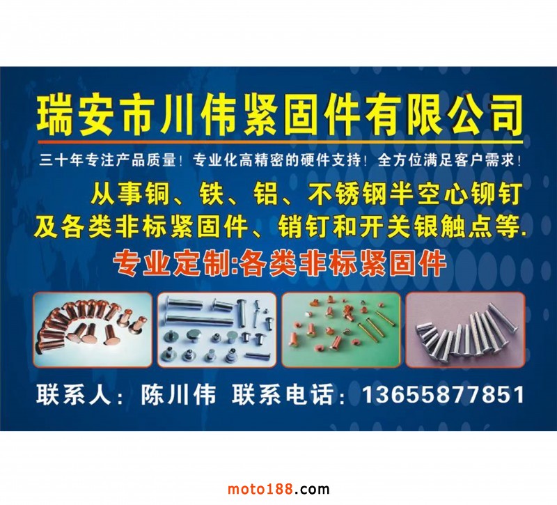 【瑞安市川偉緊固件有限公司】專業生產銅鐵鋁不銹鋼鉚釘,銷釘,觸點設備精良技術力量雄厚!與國內外兩百余家汽摩配知名廠家皆有合作,產品遠銷東南亞,德國,日本等!