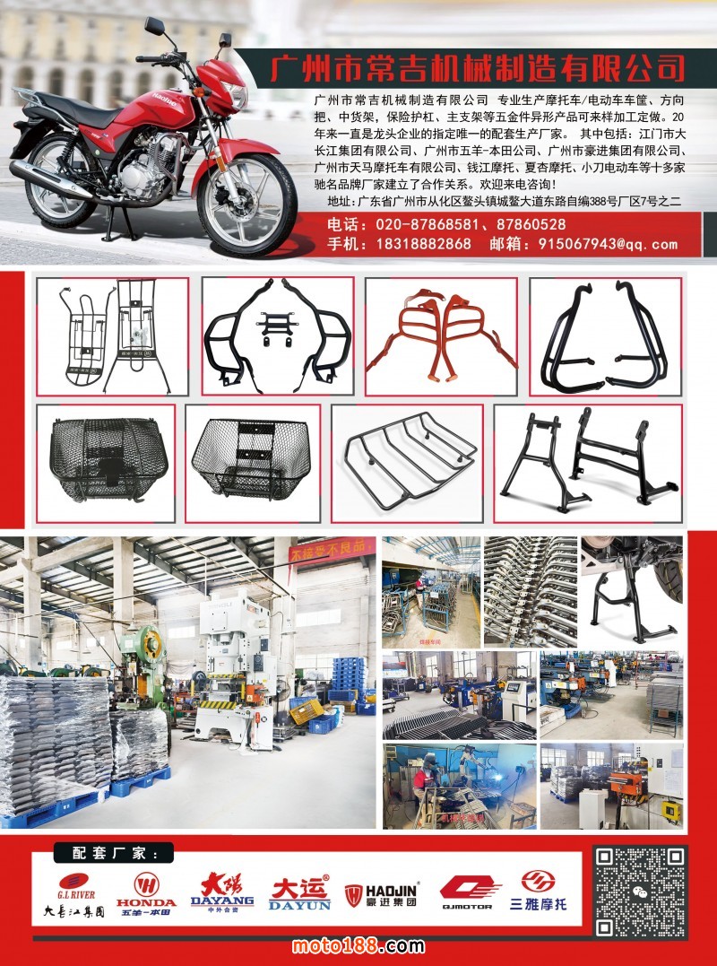 廣州市常吉機械制造有限公司專業生產摩托車/電動車車筐、方向把、中貨架,保險護杠、主支架等五金件異形產品可來樣加工定做。20年來一直是龍頭企業的指定唯一的配套生產廠家。其中包括:江門市大長江集團有限公司、廣州市五羊-本田公司、廣州市豪進集團有限公司、廣州市天馬摩托車有限公司、錢江摩托、夏杏摩托、小刀電動車等十多家馳名品牌廠家建立了合作關系。
