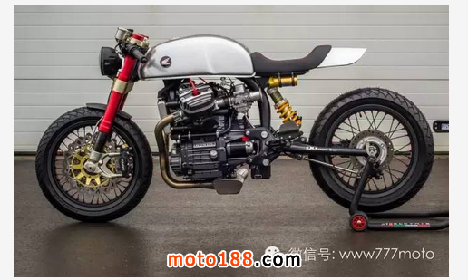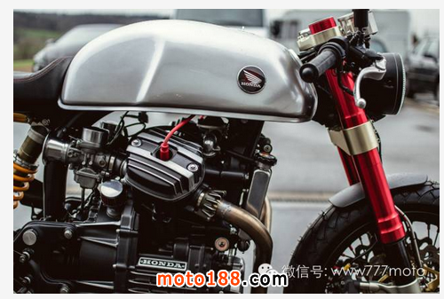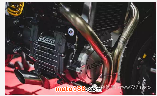 為完整保留那粗曠的性感,他將引擎外觀烤上深邃的霧黑再配上那Y字排氣管前段,完全展現老V缸的美!追求一個極簡造型他去除掉不必要的零件與車殼,讓車身輕量化同時線條變得利落,簡單的鋼管后搖臂配上?lhins中置避震,引擎到后輪線條一氣呵成。為了展現咖啡風格前叉用上強壯的紅色倒叉,三角臺角度設定的更挺直,讓CX500的重心向前傾倒,最后裝上分離斜把、單座皮椅、拋光的大油箱與單片后土除。一個重獲新生濃郁咖啡味的HONDA CX500出現在你眼前。