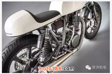經(jīng)過改裝的“CBC”外觀十分簡(jiǎn)潔、大方,還很低調(diào)。它不僅是簡(jiǎn)單的外觀改裝,最大輸出也進(jìn)行了了適當(dāng)調(diào)整。發(fā)動(dòng)機(jī)并沒有太大的改動(dòng),只是由fladside carb(三國)TM36偏置化油器和K&N莢式濾清器帶來了小小的性能提升。排氣管末端加入了supertrapp排氣音效器,經(jīng)典線條和底部邊緣的光滑曲線取代了原本看似廉價(jià)的金屬棱,拋光的緞面處理加上新潮的管道外包,無不產(chǎn)生令人敬畏的震撼效果。