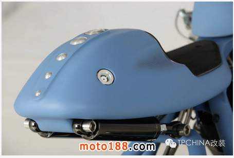 野性工坊重點設計和改造了底盤:管式車架精心設計,并與座墊支架和后擺臂相接得嚴絲合縫、水乳交融,同時還充當了腳蹬安裝基座;腳蹬的功能也不錯,允許騎手根據個人喜好調節位置。別致醒目的后擺臂是“多面手”,不僅尾端安裝了后輪、上部安裝了雙減震器,而且充當了安裝電池的基座,位置就在樞軸之處。尾部凸起的駝峰同樣“內藏玄機”,兼顧扮演了機油室的角色。