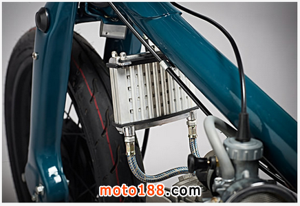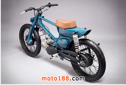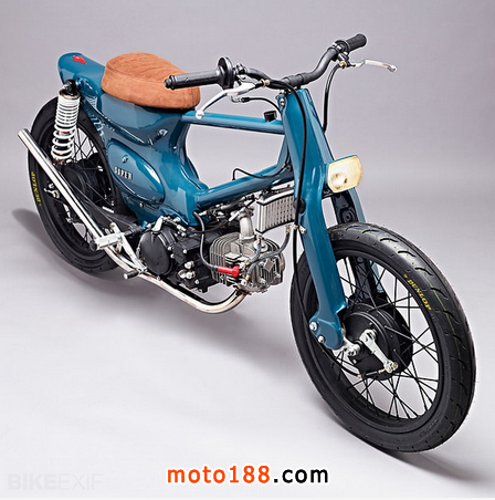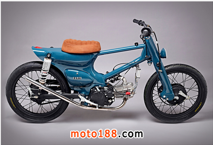 一部以 Honda 超級(jí)幼獸(Super Cub)為基礎(chǔ)改裝而成的定制車 “ 鹽罐 ”(Salt Shaker),是來自荷蘭阿姆斯特丹的超級(jí)摩托車公司(Super Motor Company)早年之作品。該作品采用了一個(gè) “ 咖啡賽車 ” 的造型,鄧立普的高性能賽車級(jí)的輪胎,完全拆除了儀表板。而原廠的 Honda 發(fā)動(dòng)機(jī)被完全棄用,取而代之的是來自中國銀翔的、最大馬力輸出達(dá)到 22 匹(經(jīng)改裝之后的數(shù)字)的 150 cc 臥式發(fā)動(dòng)機(jī)。