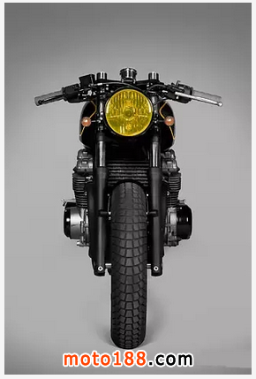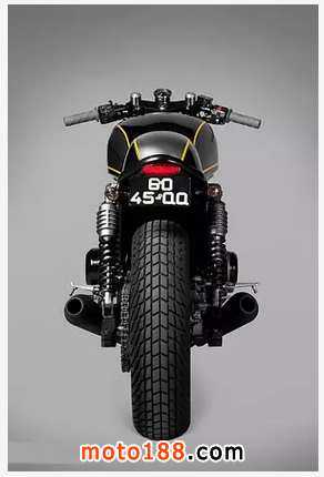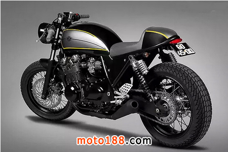 輪轂改為黑色輻條輪轂,車把降低的同時(shí)有一個(gè)向下的角度,典型的Cafe Racer車把,車尾部分改為單座加小駝峰。