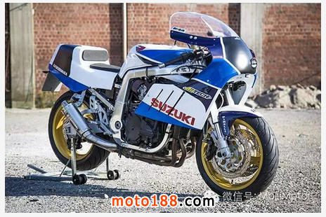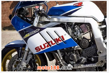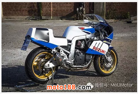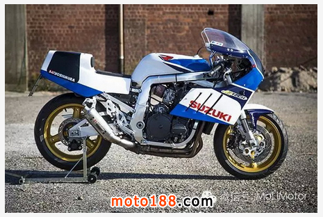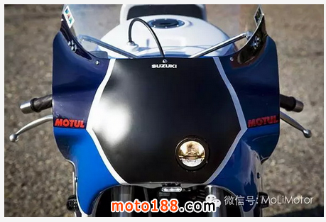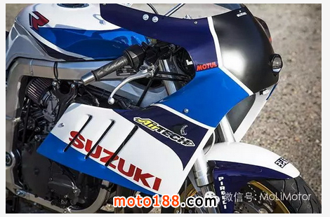 復(fù)古車配件,讓他成為終極的道路使用車. 他發(fā)現(xiàn)在美國有一家Airtech公司有生產(chǎn)整套AMA Yoshimura F1 復(fù)刻版整流罩, 馬上訂購把東西送到德國準(zhǔn)備烤漆與貼紙的制作, 第一件事情就是把所有整流罩噴成北極白,Suzuki專用的配色,還有貼上贊助商貼紙!