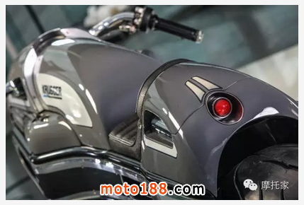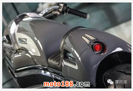 油箱口、鑰匙總成、前后燈具全設計成內藏式。而且從手把、腳踏、座椅等等改造風格隱約看出復古咖啡風范。前后單搖臂的設計形式更是克魯格一貫的強項。