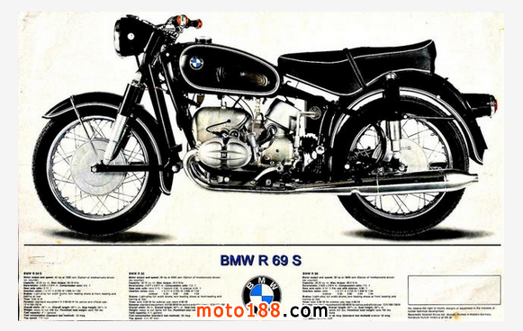 這是一張古老的寶馬摩托車宣傳頁,上面記載了R 69 S的長寬高分別是 2125 × 722 × 980 mm,車重202kg,百公里油耗為5.3L。之所以我們今天還能見到這臺珍貴的60年代寶馬摩托車,是因為在歐洲根本就沒有強制摩托車報廢這個說法,所以眾多經典好車得以留存,而我們的摩托車只能騎11年就要去交到報廢廠,再好的車也只能進熔鐵爐,老周認為有些好車騎個十幾二十年沒問題,倒是報廢會浪費資源。