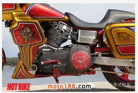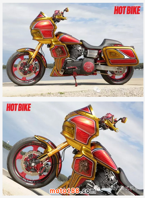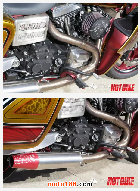 BBC的創(chuàng)始人Kevin在解釋這幅作品時說,其實(shí)這臺街霸改裝不是簡單塑造badass的形象,更是匠心獨(dú)運(yùn)地融合了BBC產(chǎn)品線中所有為哈雷戴納車系設(shè)計(jì)的改裝件,包括整流罩、邊箱、前叉、電池箱蓋、電線線束,以及戴納排氣管等等。難怪它的風(fēng)格會如此統(tǒng)一!