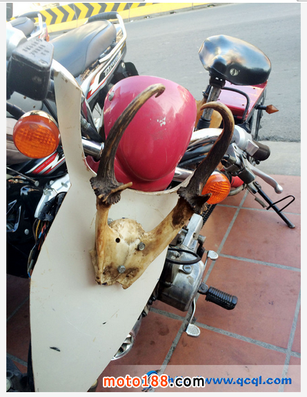一部來自街頭的作品,搭載了一副 Honda Cub 50 的臥式發動機,踏板車/迷你車的 10 英寸前、后車輪,前鼓后碟的制動系統,渦輪狀的空氣濾清器,Honda Scoopy 踏板車的儀表板,“ 炸街 ” 級的排汽管,“ 不對稱 ” 的后雙筒減震器,自行車的 “ 標配 ” 鞍座,隨意可見縫縫補補的主車架和后擺臂,制作者似乎把身邊能拿來一用的所有物品都往這車上糊 ...而車頭的一對羊角,卻也仿佛是有意無意凸顯了作坊附近的環境。
