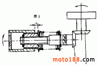 2. 發動機后傳動部分緩沖軸在車輛突然減速行駛時起不到緩沖作用,這也是加劇齒輪減速接觸面磨損的又一原因。后傳動緩沖軸的傳動結構 如圖1 所示,發動機在啟動或加速時,通過傳動軸將旋轉運動傳遞給傳動套,傳動套開始沿與之梯形螺紋配合的花鍵套旋轉前移,移動距離 α 后,傳動套開始壓縮緩沖彈簧,緩沖彈簧壓縮到一定程度,傳動套才逐漸帶動花鍵套作旋轉運動,而花鍵套又通過與之配合的花鍵軸將運動傳遞給兩圓錐齒輪,然后由兩圓錐齒輪驅動后輪,使摩托車前進或加速行駛,從而避免了兩圓錐齒輪在摩托車啟動或加速行駛時的剛性沖擊。當急回油門,摩托車減速行駛時,后輪由于慣性作用,使原從動齒輪變為主動輪,原驅動齒輪變為從動輪,由于沒有相應的緩沖結構,此時,旋轉運動由圓錐齒輪 2 迅速傳遞給圓錐齒輪 1 ,如果存在齒側間隙,那么兩圓錐齒輪的減速接觸面肯定會產生剛性沖擊,從而出現異常的沖擊噪聲。從實物的檢測看,兩圓錐齒輪減速接觸面的沖擊磨損痕跡非常明顯,這也就驗證了我們分析的正確性。