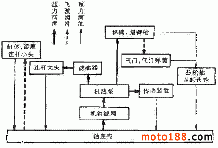 CG125 潤(rùn)滑系統(tǒng)是按下圖 所示循環(huán)的,筆者結(jié)合該循環(huán)圖和對(duì)機(jī)油消耗試驗(yàn)的分析總結(jié)如下。