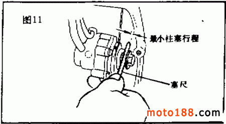 先使發(fā)動機低速運轉(zhuǎn),觀察機油泵的調(diào)整擋板,然后使發(fā)動機熄火,讓調(diào)整擋板滑到最右端,用塞尺檢查最小柱塞行程,如圖 11所示。最小柱塞行程應(yīng)為 0.20 ~ 0.25mm ,若測出的值與此值不符,則應(yīng)進行調(diào)整。行程過大應(yīng)減少墊片,行程過小,則應(yīng)增加墊片。